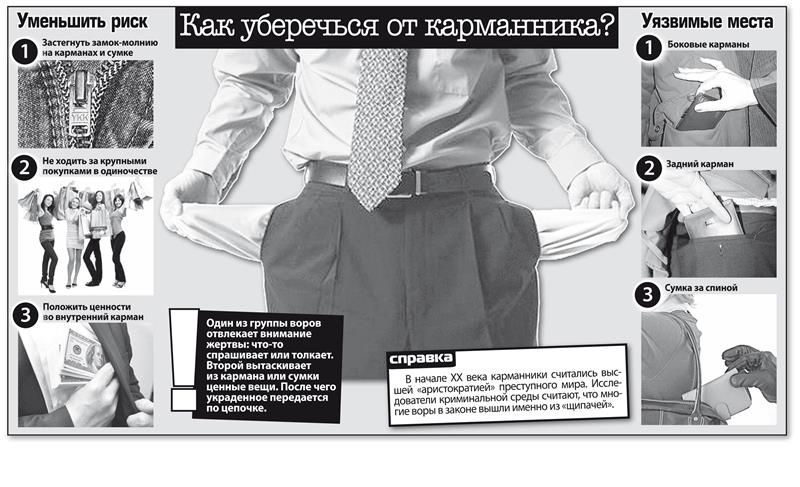 Карманные кражи традиционно считаются у работников правоохранительных органов одними из самых трудно раскрываемых. Ведь чтобы доказать вину, вора надо буквально поймать за руку. Одним из любимых мест карманников по-прежнему остается общественный транспорт, за исключением метро, говорят правоохранители. Чаще всего их можно встретить в трамваях №№13 и 20, маршрутках и автобусах №№ 126, 1, 247, а также во всех видах транспорта (кроме полупустых троллейбусов), идущих по проспекту Кирова.