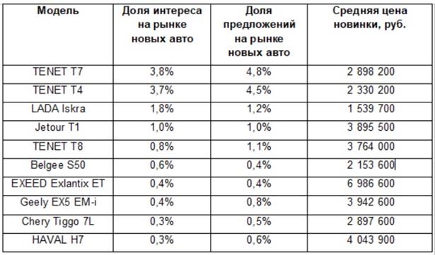 Самым популярным автодебютантом 2025 года стал TENET T7 — эта модель лидирует как по доле интереса пользователей, так и по доле в предложении на российском рынке. При этом доля авто, которые вышли на российский рынок в 2025 году, составила почти 20% от общего объема предложений новых автомобилей в первом квартале 2026 года.