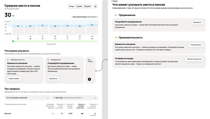 "Среднее место в поиске" показывает, на каких позициях находятся объявления, как эта позиция меняется со временем и доходят ли до объявлений пользователи при просмотре выдачи. Например, если объявление находится ниже зоны, до которой долистывают пользователи, система прямо укажет на это и предложит продавцу конкретные действия: доработать объявление, предложить покупателям скидки или усилить продвижение.